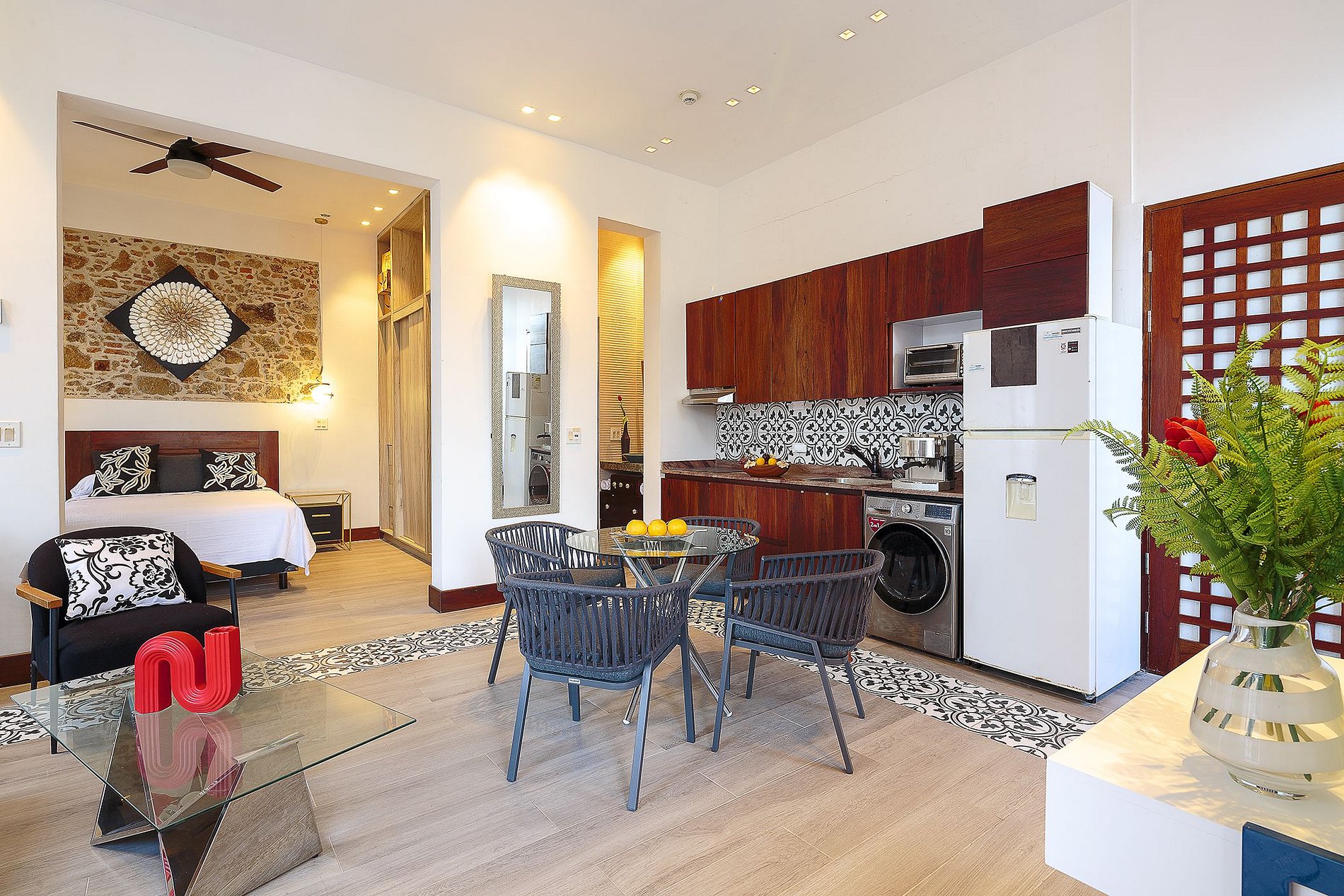 Villas La Fontana stands out for its perfect blend of history and modernity. Its unique location in Casco Antiguo allows guests to immerse themselves in the cultural richness of a UNESCO World Heritage site. The building’s historic architecture is seamlessly combined with fully equipped luxury suites, a rooftop pool with spectacular views, and spacious balconies that let guests enjoy the essence of Casco Antiguo. Personalized attention and concierge service provide an exclusive and unique experience.